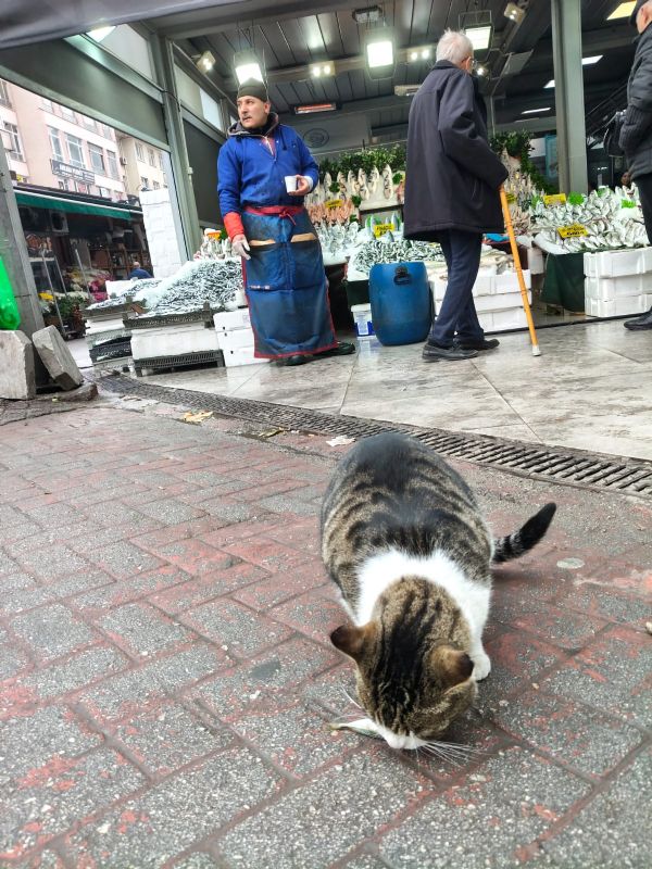 Bir obez kedi; henüz bir yaşında bile değil. Tezgâhların önünde nöbette. Balıkçı, müşterilerin arada bir boş bıraktığı tezgâhtan bir hamsiyi kuyruğundan tutup kediye fırlatıyor. Kedi balığa doğru ağır çekim yürüyor. Sırtını tezgâha dönüyor. Yayalara aldırış etmiyor, korkmuyor. Ya oralarda doğdu ya yavruyken oralara bırakıldı.