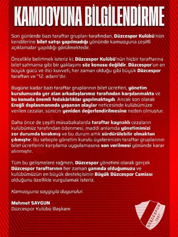 ”Tüm bu gelişmelere rağmen Düzcespor yönetimi olarak gerçek Düzcespor taraftarının her zaman yanında olduğumuzu ve kulübümüzün en büyük destekçisinin Büyük Düzcespor camiası olduğunu özelikle vurgulamak isteriz.Kamuoyuna saygıyla duyurulur.”